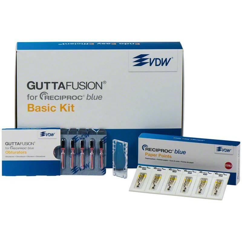 El envase de Obturadores Guttafusion Basic Kit para Reciproc Blue de Zipperer contiene: 3 blisters de 6 unidades R25 + 1 blister de 6 unidades R40 + 1 blister de 6 unidades R50 + Block de practica de obturación para GUTTAFUSION + Surtido de Puntas de papel Reciproc esterilizadas R25, R40 y R50