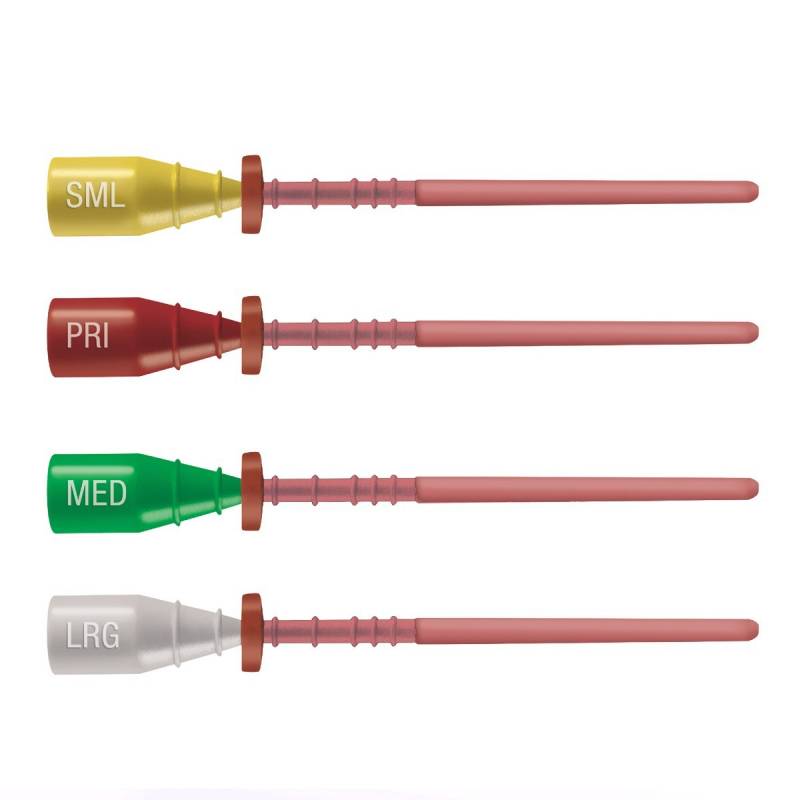 4 tamaños disponibles codificados por color: Primario (rojo) - pequeño (amarillo) - medio (verde) - largo (blanco).