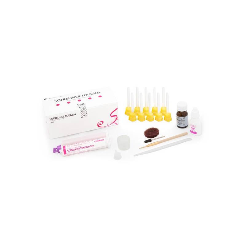 Sofreliner Tough está indicado para dolor dental por bordes afilados del hueso alveolar y atrofia de la mucosa. Retención deficiente debida a una atrofia extrema de la cresta alveolar. En caso de huecos de gran tamaño maxilares/mandibulares. También para retención de sobre-dentaduras antes de la colocación definitiva.