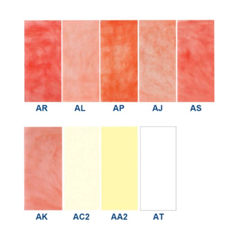 - 6 tonos de rosa veteado: AR regular, AL claro, AP rosa, AJ rosa claro, AS estándar y AK clásico.