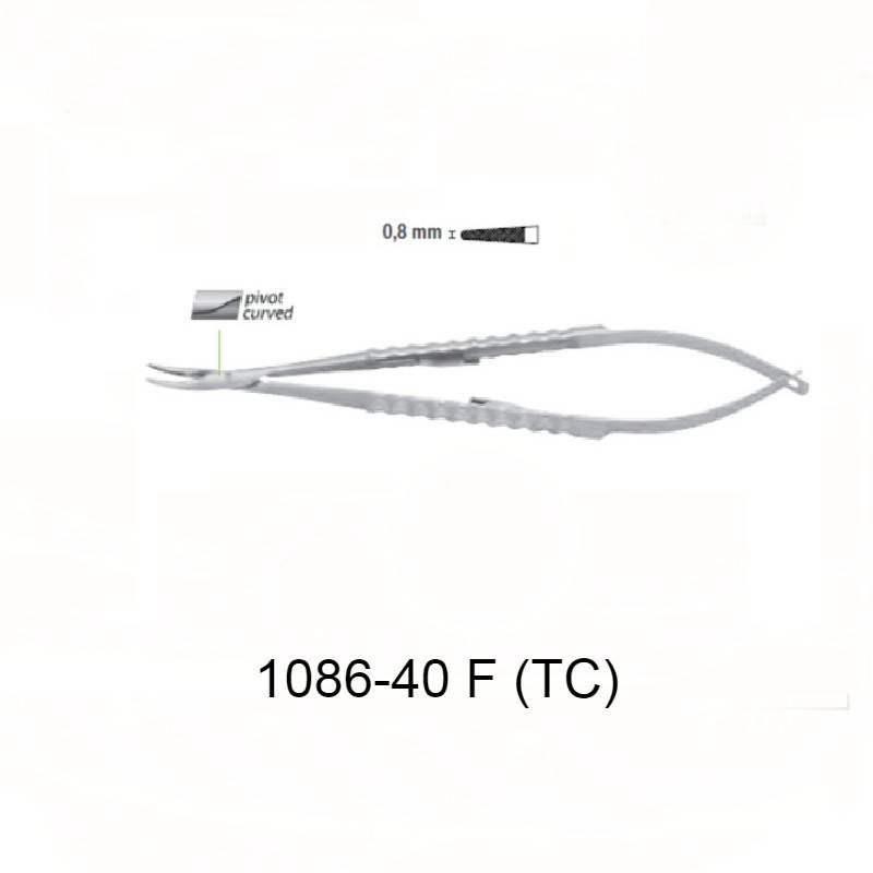 - 1086-40 F - Micro aguja soporte “Barraquer” 17,1 cm, TC, 0,8 mm, recto. Mango RS. Portaagujas para microagujas con bloqueo para cirugía mínimamente invasiva. Con carburo de tungstero. Se recomienda su uso con hilo de sutura: 5-0 y 8-0.