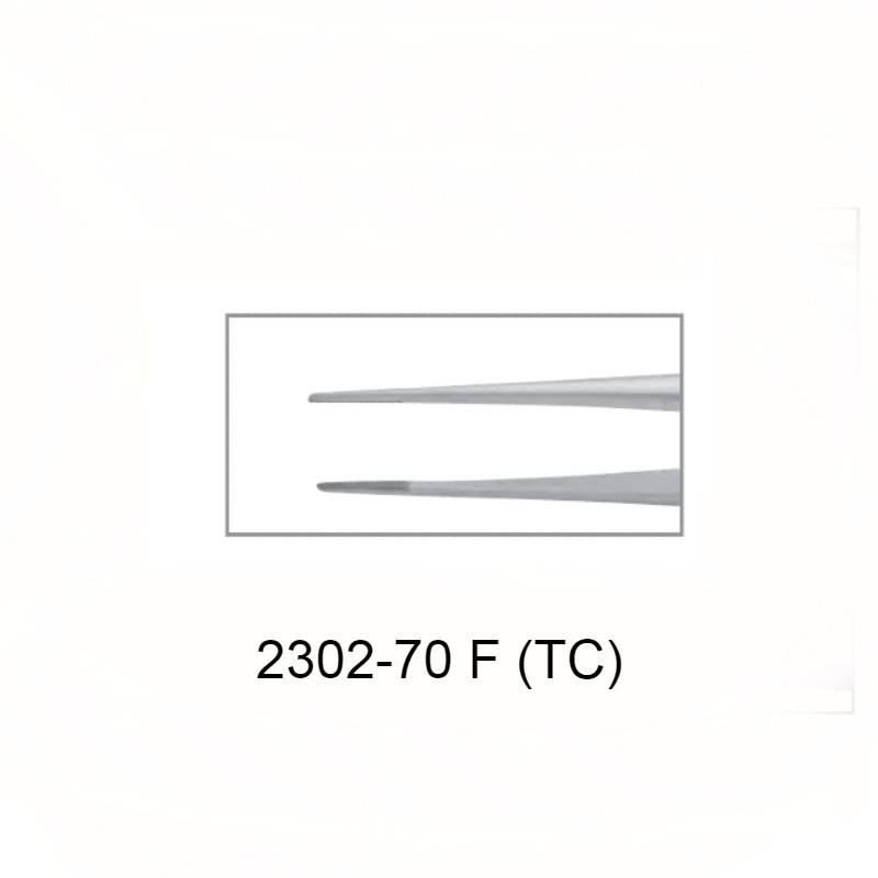 - 2302-70 F - Pinzas de disección, micro, 17,1cm - TC - 0,8 mm, recta. Mango RS. La parte activa de esta micro pinza anatómicas cuentan con una placa de carburo de tungstero duradera (ranuras cruzadas finas). Son aptas para sujetar suavemente tejido vulnerable como vasos sanguíneos o nervios.