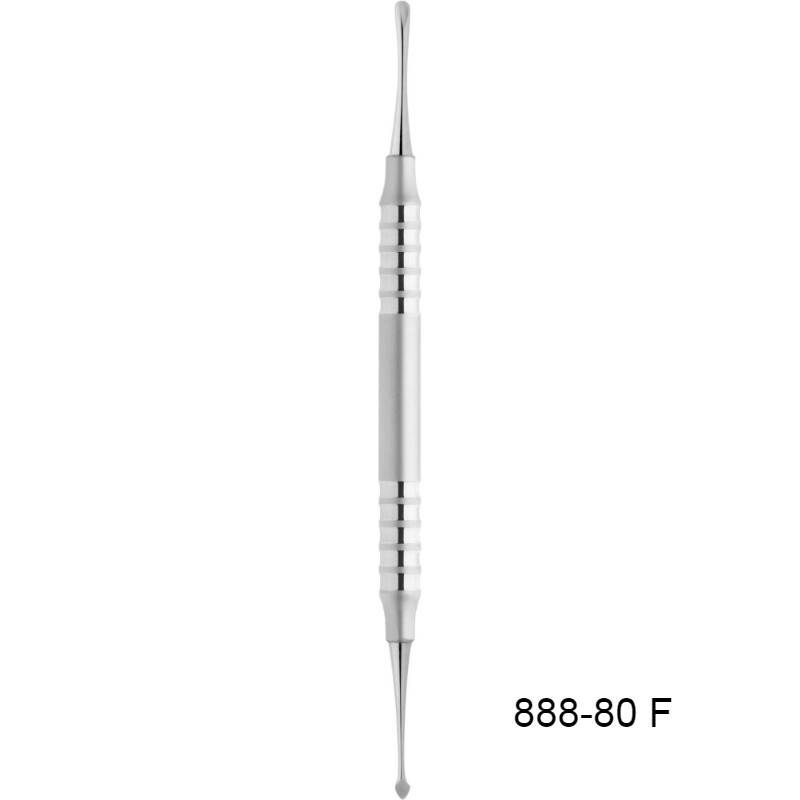 - 888-80 F - Micro elevador perióstico “Iglhaut” 17,1 cm. Mango SL. Doble parte activa, su parte activa con forma de lanza permite el desprendimiento de la papila así como de la cresta marginal de la encía. La aleta mucoperiostal se puede desprender suavemente con su parte activa con forma de pala.