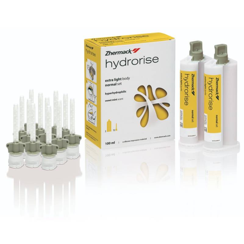 La silicona A de hiperhidrocompatible Hydrorise es un sistema de silicona A de baja vicosidad para prótesis fija, indicado tanto para la técnica de dos fases (doble impresión) como para la de una fase (simultánea).