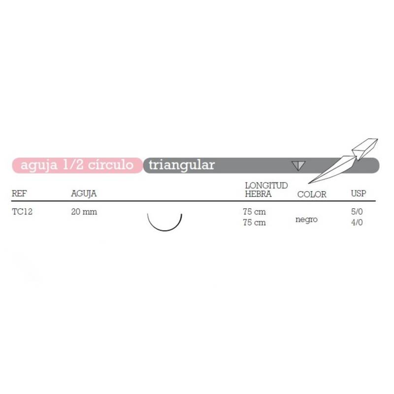 Sutura Supramid TC-12 Monofilamento Aguja 1/2 Círculo Triangular 20mm USP 5/0 Hebra 75cm Negro, No Absorbible 36u Aragó