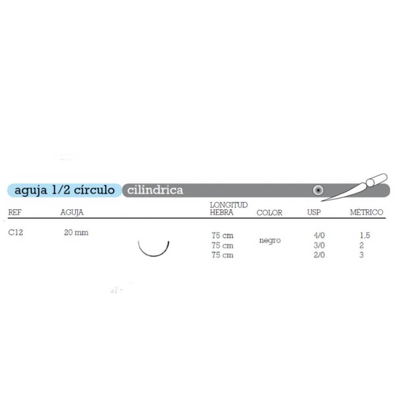 SUTURA SEDA C-12 AGUJA 1/2 CÍRCULO CILÍNDRICA 20 MM HEBRA 75 CM NEGRA, NO ABSORBIBLE