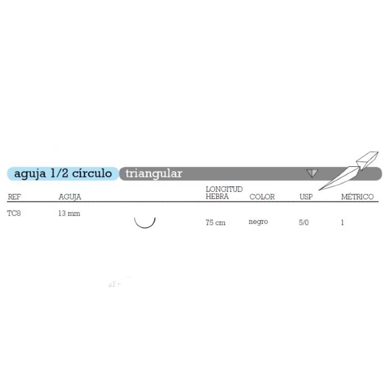 SUTURA SEDA TC-8 AGUJA 1/2 CÍRCULO TRIANGULAR 13MM USP 5/0 HEBRA 75 CM NEGRA, NO ABSORBIBLE