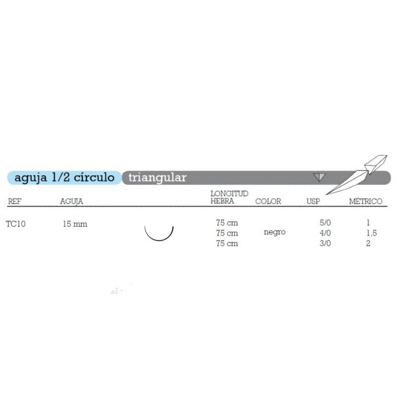 SUTURA NO ABSORBIBLE DE SEDA TC-10 AGUJA 1/2 CÍRCULO TRIANGULAR 15MM HEBRA 75 CM NEGRA