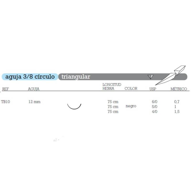 SUTURA NO ABSORBIBLE DE SEDA TRENZADA TB-10 AGUJA 3/8 CÍRCULO TRIANGULAR 12 MM HEBRA 75 CM NEGRA