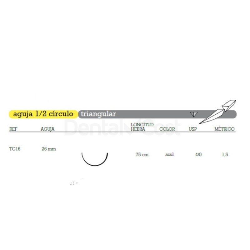 SUTURA NO ABSORBIBLE DE NYLON TC16 AGUJA 1/2 CÍRCULO TRIANGULAR 26 MM USP 4/0 HEBRA 75 CM AZUL
