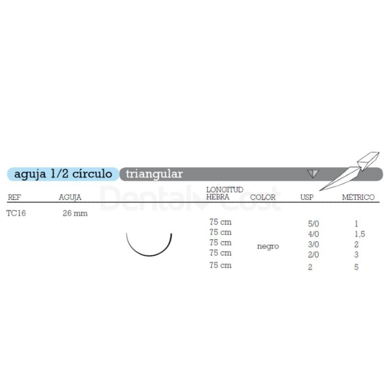 SUTURA NO ABSORBIBLE DE SEDA TC-16 AGUJA 1/2 CÍRCULO TRIANGULAR 26 MM HEBRA 75 CM NEGRA