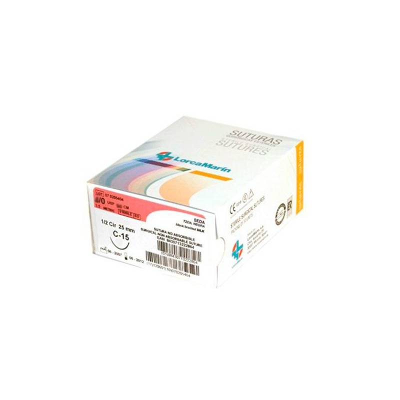 La caja de sutura de seda C-15 5/0 de Lorca Marin contiene 12 unidades.