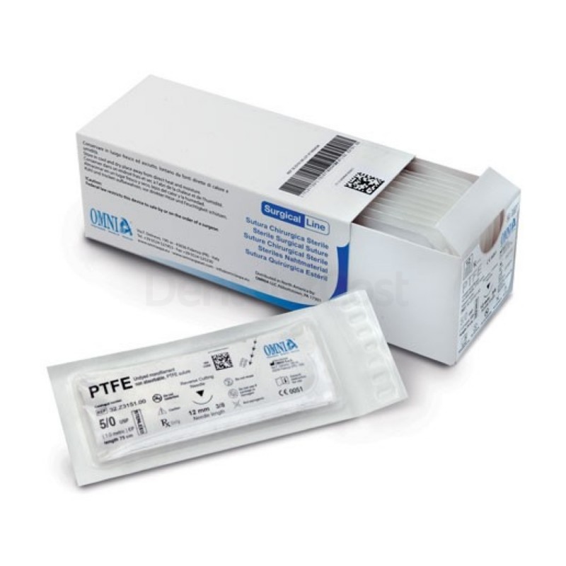 Sutura PTFE USP 5/0 Aguja 12mm 3/8 Círculo Punta Cortante, Hebra 75cm Estéril Caja 12 uds Omnia