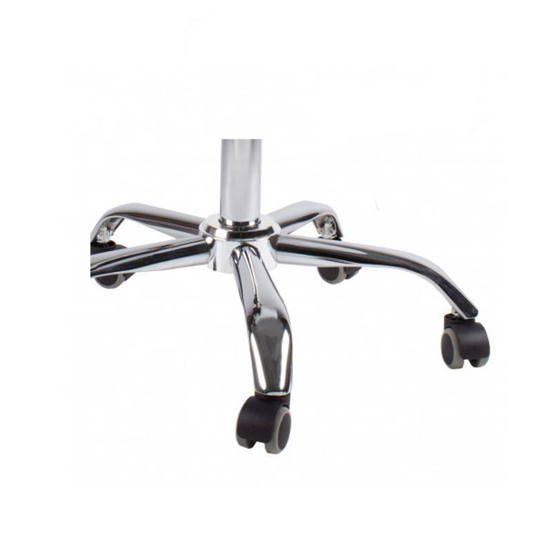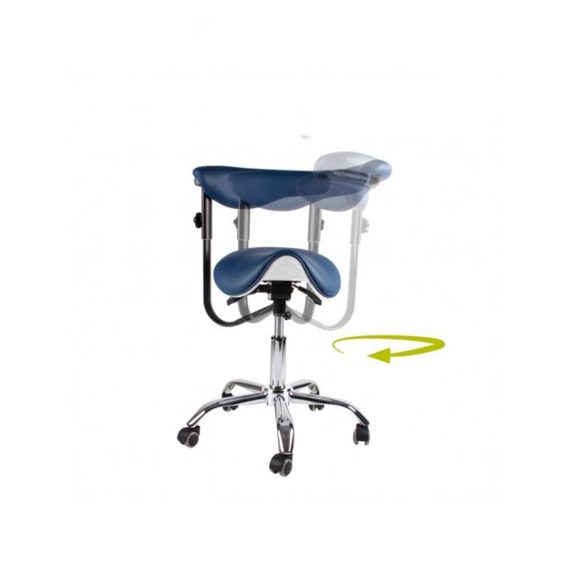 Taburete dental con base giratoria y elevación neumática mediante palancas, para un ajuste rápido.
