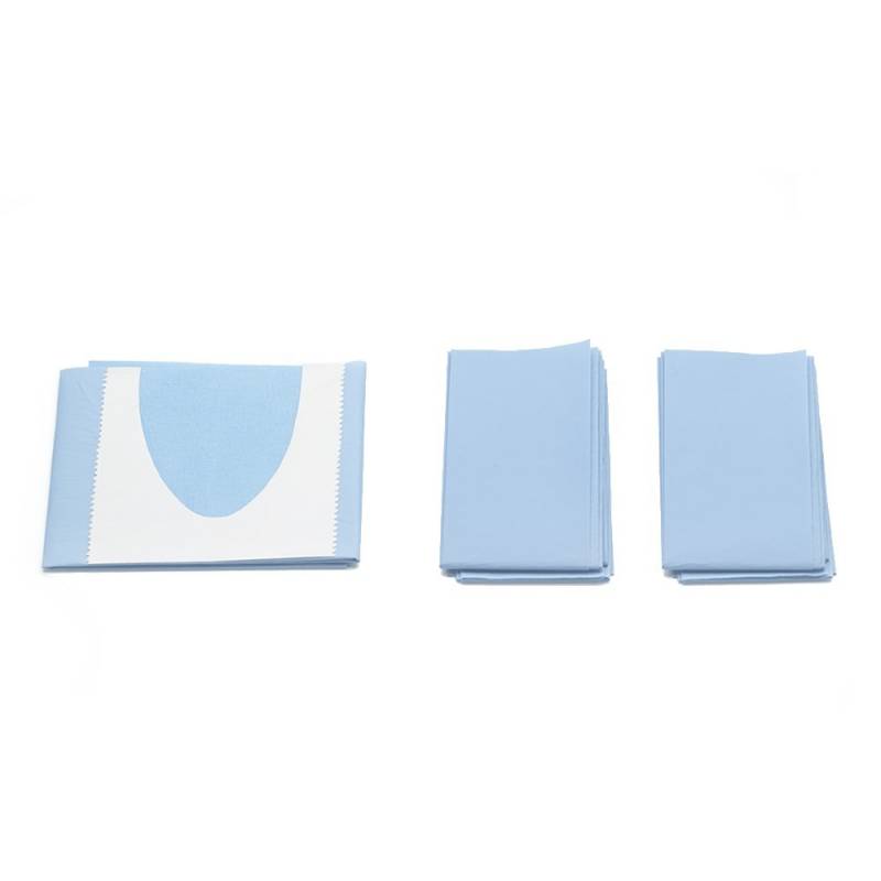 El set tallas de Alle Dental contiene: 2 Tallas quirúrgicas 50 x 75 cm y 1 Talla con fisura en U y adhesivo 50 x 75 cm y fisura 11 x 9 cm.