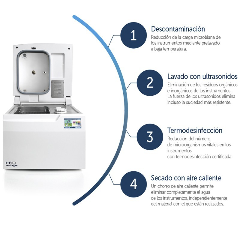 Descontaminación, lavado con ultrasonidos, termodesinfección y secado con aire caliente en un único ciclo.