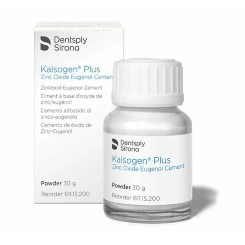 El Kalsogen Plus de Dentsply es un polvo para mezclar y formar cemento de óxido de zinc y eugenol de fraguado rápido.