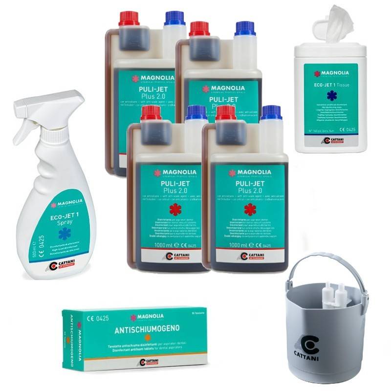 El kit Magnolia de Cattani contiene: 4 botellas de Puli-Jet Plus 2.0, 1 Eco-jet Spray, 1 Eco-Jet Toallitas, 1 antiespumogenos y un cubo Pulse Cleaner.