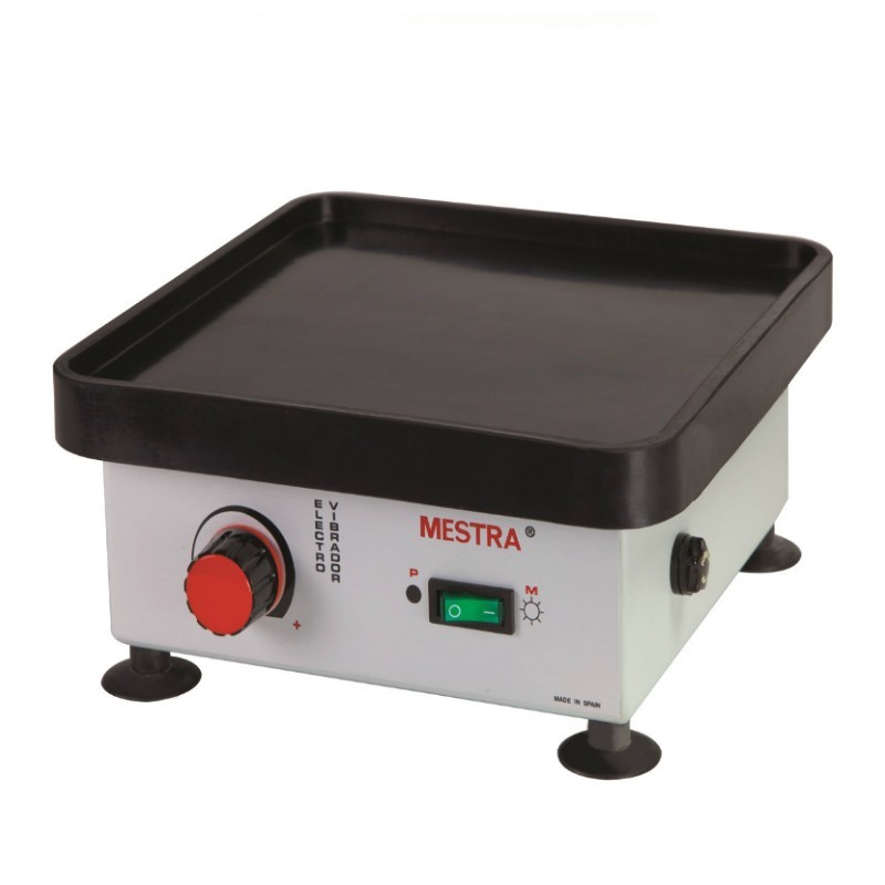 El vibrador Mestra para yeso R-080020 presenta una forma cuadrada con una superficie de trabajo 220 x 220 mm - altura 105mm - peso 6,3kg.